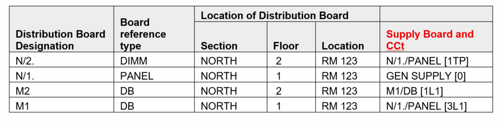 To create a schematic showing how distribution boards are connected, two key pieces of information for each board is required: its physical location and its power source.
