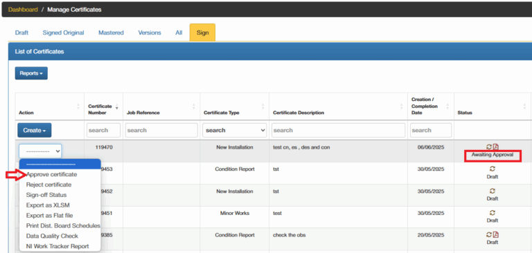 3. Complete on the signing off by logging into EDIS, go to the certificate list and approve  the sign-off by clicking Approve Certificate in the Action column.