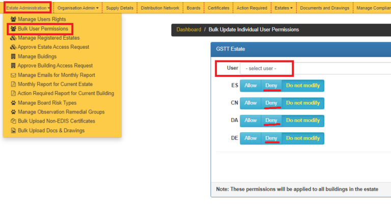 1. Select ‘Bulk User Permissions’ menu option : then deny access for the user, this will remove all permissions in all the estates buildings, then,