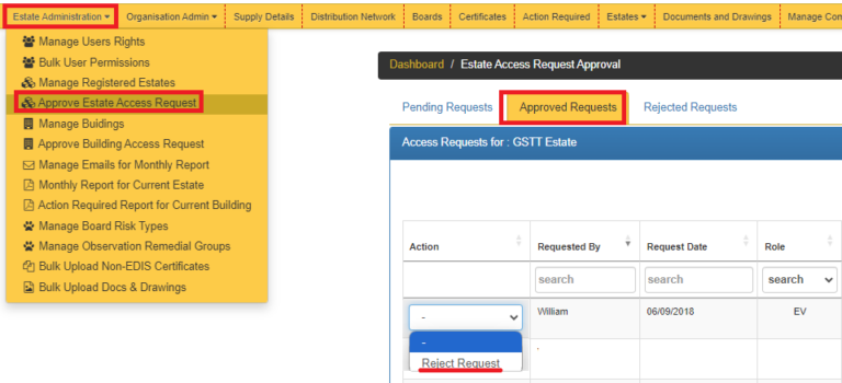 2. Select ‘Approve Estate Visibility’ menu option, View the approved requests tab, then reject the request ], this will remove estate visibility for the user